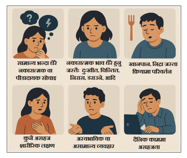 - व्यवहार – आफ्नो दैनिक काम गर्न असहज हुने, टोलाइरहने, छटपटी हुने, वा काममा ध्यान दिन नसक्ने। असामान्य व्यवहार गर्ने, एक्लै बस्न खोज्ने, हानिकारक पदार्थको सेवन गर्ने, वा कुनै हानि गर्ने व्यवहार देखाउने, आदि।